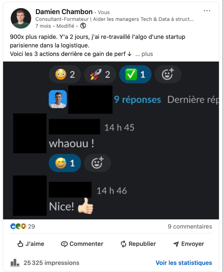 Il y a des succès, des projets qui fonctionnent bien. Comme la division par 2 des coûts d'infrastructure IT d'une entreprise dans la logistique. La création de tableaux de bord accessibles en 3 clics pour surveiller la performance de l'entreprise. Ou un algorithme permettant d'identifier des formules chimiques prometteuses avec un retour sur investissement de +300 000 €.