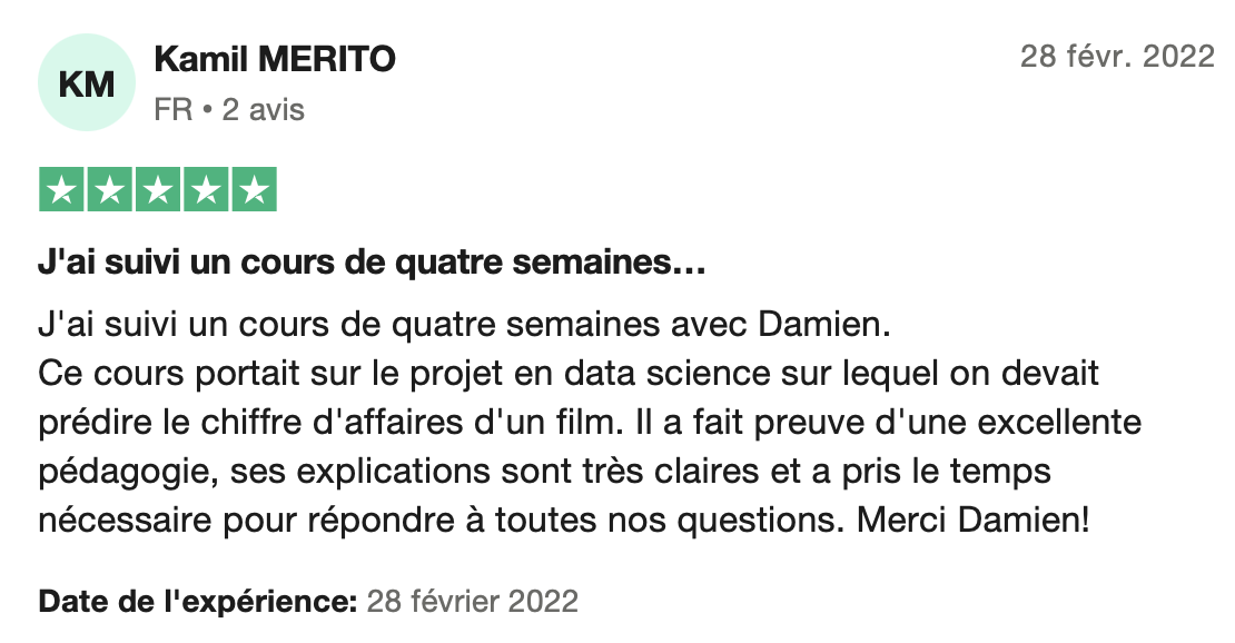 Pendant la période Covid, je lance mes premières formations en ligne pour partager mes connaissances en Data Science et Machine Learning. Le succès est au rendez-vous : +2000 personnes qui suivent ma newsletter, 4 formations lancées, 500 personnes formées, 7000 abonnés YouTube dont une vidéo à +90 000 vues. Une nouvelle façon de transmettre ma passion.