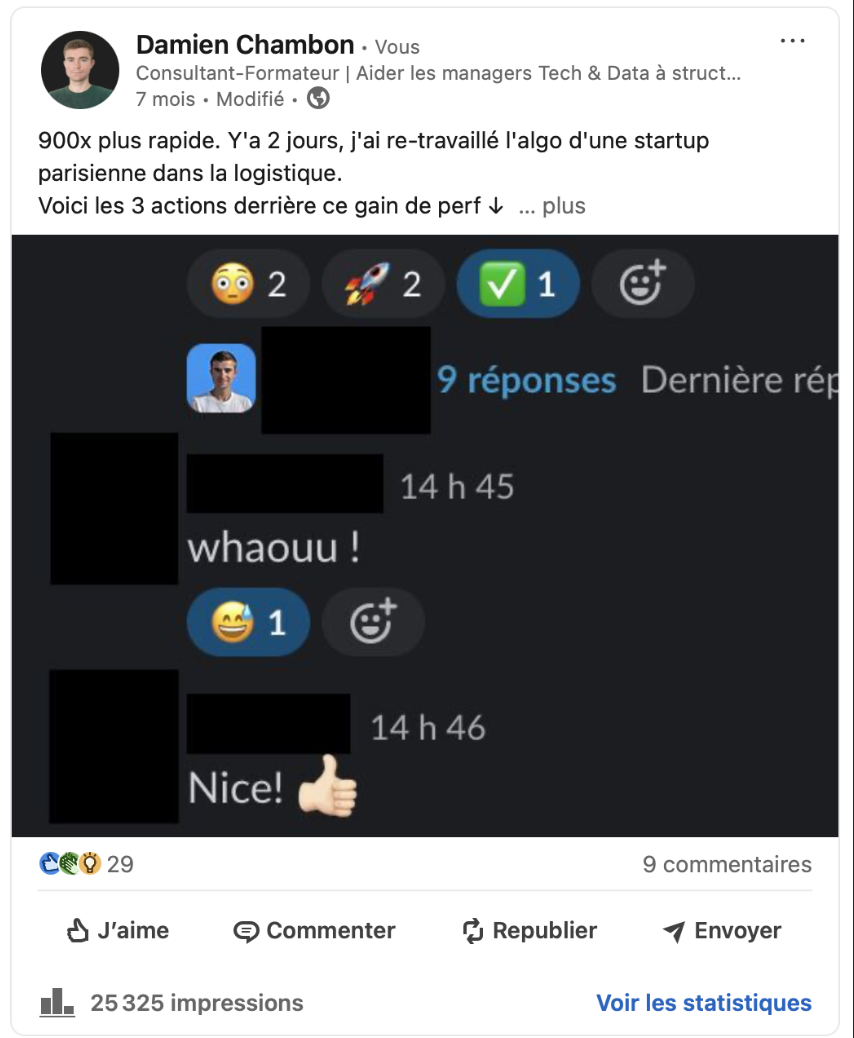Post LinkedIn sur un projet qui a permis d'accélérer des algorithmes bloqués depuis 6 mois