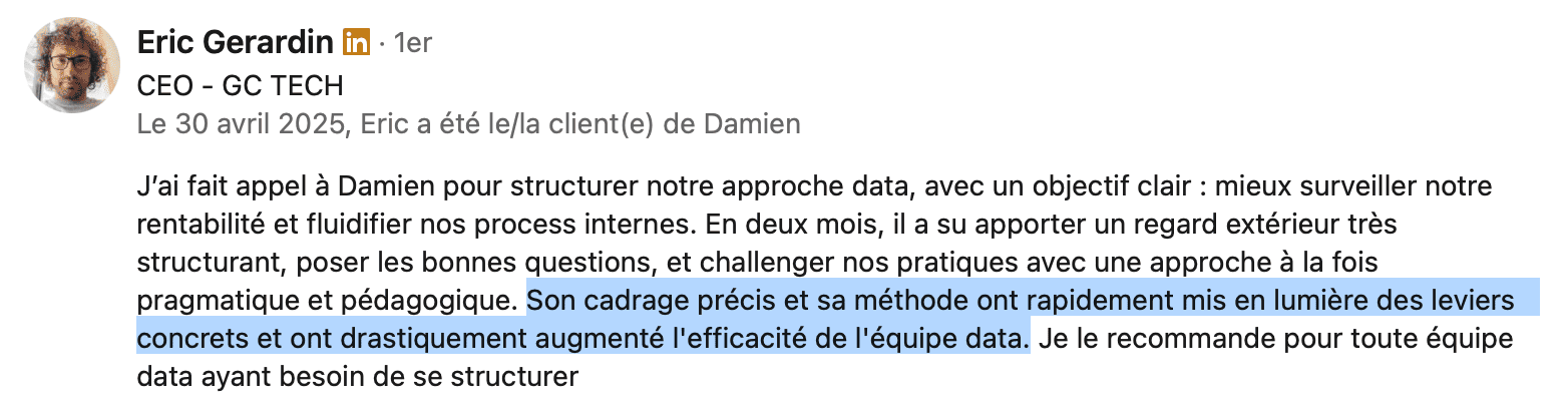 Aujourd'hui, j'aide les leaders de la Tech à créer des feuilles de route sur 3 mois, à résultats garantis grâce à une formule mathématique (au lieu de prioriser au doigt mouillé).